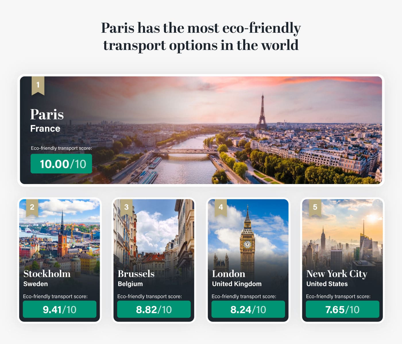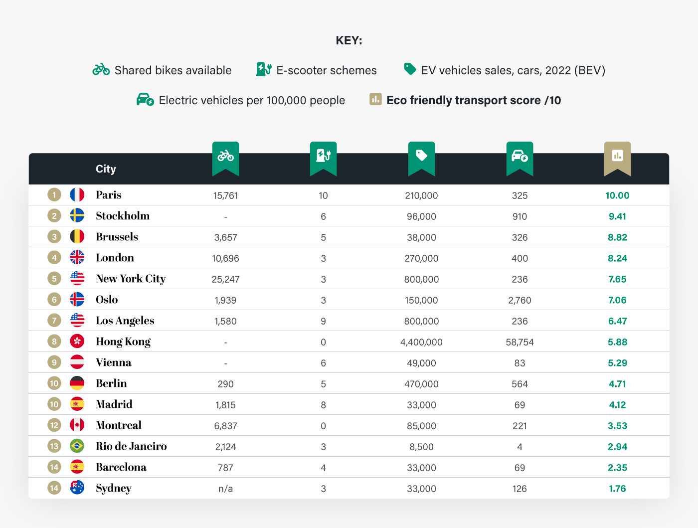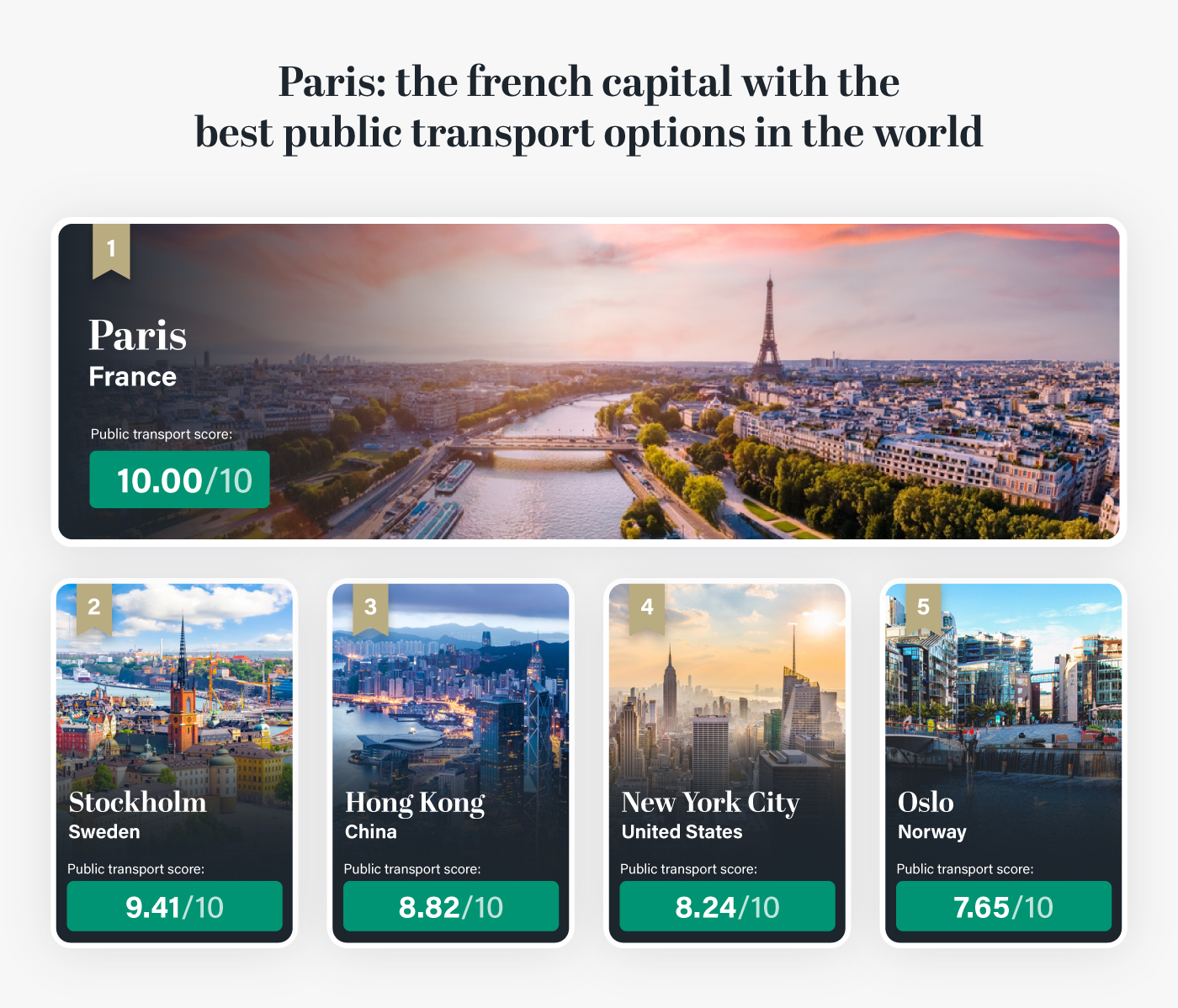 Link to William Cooper user page William Cooper Marketing Director For many aspiring expats, the most important things to consider when moving to a new country are often the cost of living and finances, rather than options for local public transport. That being said, many expats are now choosing to live more sustainably when fleeing to a new country, so getting around using eco-friendly public transport is equally important. With the proliferation of companies like Lime and Bolt, in many cities, it’s easier than ever to rent an electric scooter to help reduce emissions in the area and avoid city traffic. With this in mind, we want to crown the best cities for public transport options in the world, investigating which countries are leading the way with their transportation, from metro routes to rentable bikes, e-scooters and electric vehicles. For those thinking about becoming a digital nomad and are considering travelling across the world using metro systems, it is important to consider international health insurance. In this article Which country has the best public transport options in the world? Which country has the most eco-friendly transport options? Which country has the most public transport stops? Which country has the most electric vehicles? Which country has the best public transport options in the world? Paris: The French capital with the best public transport options in the world 1/ Paris, France Public Transport Score: 10 out of 10 The romantic city of Paris achieved top marks in our global transport index, with a score of 10 out of 10. According to 2022 data from Statista, almost 70% of residents living in the French capital use Metro, buses or suburban trains to commute to work, compared to 40.7 percent of employees in Lyon, the third most populous city in France. Paris has low public transport costs with the average ticket costing just £1.85, which is relatively inexpensive considering the cost of living in the city is among the highest in the world. Paris’ numerous transport options make travelling around the city easy and accessible. There are ten electric scooter schemes available in Paris, including; Lime, Bird, Bot, Wind, Tier, Flash, Hive, Voi, Dott and Uber’s new Jump. The schemes are recent, with Lime being the first to appear in 2018. The innovative new e-scooters are free-floating, meaning tourists can hire them and leave them anywhere without needing a docking station. 2/ Stockholm, Sweden Public Transport Score: 9.41 out of 10 Ranking in second place is the beautiful Swedish city of Stockholm. The city is one of Europe’s most environmentally friendly, thanks to its public transport accessibility and abundance of electric vehicles. Stockholm prides itself on leading a Grow Smarter project, with hopes to be fossil-fuel-free by the year 2040. Stockholm is a densely populated city and has among the most bus stops out of all our cities (303 per 100,000 people). The city also operates a high number of public transport vehicles (1,280 per million people), which makes most districts in the area easily accessible for both tourists and residents. Sweden has recently made developments in its electric mobility and as of 2022, it has 910 electric vehicles per 100,000 people. Sweden is one of the happiest countries in the world Find out which other countries make the list here 3/ Hong Kong, China Public Transport Score: 8.82 out of 10 Hong Kong came third, scoring 8.82 out of 10. The city’s affordable transport network operates a reliable rail line for its large population. Commuters in the city tend to use it every day, despite the fact it isn’t available 24/7 like in other cities. Hong Kong scored well for its low public transport fares (£1.22 for a one-way ticket), as well as the number of buses operating in the city (1,767 per million people). Although Hong Kong has banned the use of e-scooters on carriageways, footpaths and cycle tracks, there are plenty of ways to get around, whether it’s by taxi, ferry, rail, bus or tram. Hong Kong surpassed any other city for its electric vehicles, with nearly 59,000 EVs per 100,000 people. 4/ New York City, United States Public Transport Score: 8.24 out of 10 New York City, known fondly as the Big Apple, took fourth place in our ranking. New York scored most notably for its many metro routes, which were the highest on our list, with 28 running through the city. Living up to its nickname as the “City that Never Sleeps”, subway trains in New York run 24 hours a day, seven days a week. For the cost of £2.20 ($2.75 in USD), you can use the system citywide and transfer to other subway lines as many times as you need. New York City also scored points for its bike shares available, with 25,247 bikes available at the time of writing. 5/ Oslo, Norway Public Transport Score: 7.65 out of 10 Oslo, the capital of the Scandinavian country of Norway, scored fifth place in the ranking with a score of 7.65 out of 10. Oslo has among the highest costs for a one-way ticket (£2.99) just behind Stockholm, and the Oslo Metro currently has 5 lines running through the subway. Norway has witnessed a significant increase in the sale of electric cars, but is miles behind Hong Kong, with 2,760 EVs per 100,000 people. In 2015, the Norwegian government’s initial goal of 50,000 electric cars to be on the roads was reached. Furthermore, the country is streaks ahead of other nations, as Norway waives import duties and car registration fees for electric vehicles. Top 15 cities with the best public transport options in the world Thinking about moving abroad? We look at the best places in the world to live and work Which country has the most eco-friendly transport options in the world? Paris not only tops the list for having the best public transport options in the world, but it also ranks number 1 for having the most eco-friendly transport options. 1/ Paris, France Eco-Friendly Transport Score: 10 out of 10 Paris also recorded the best score 