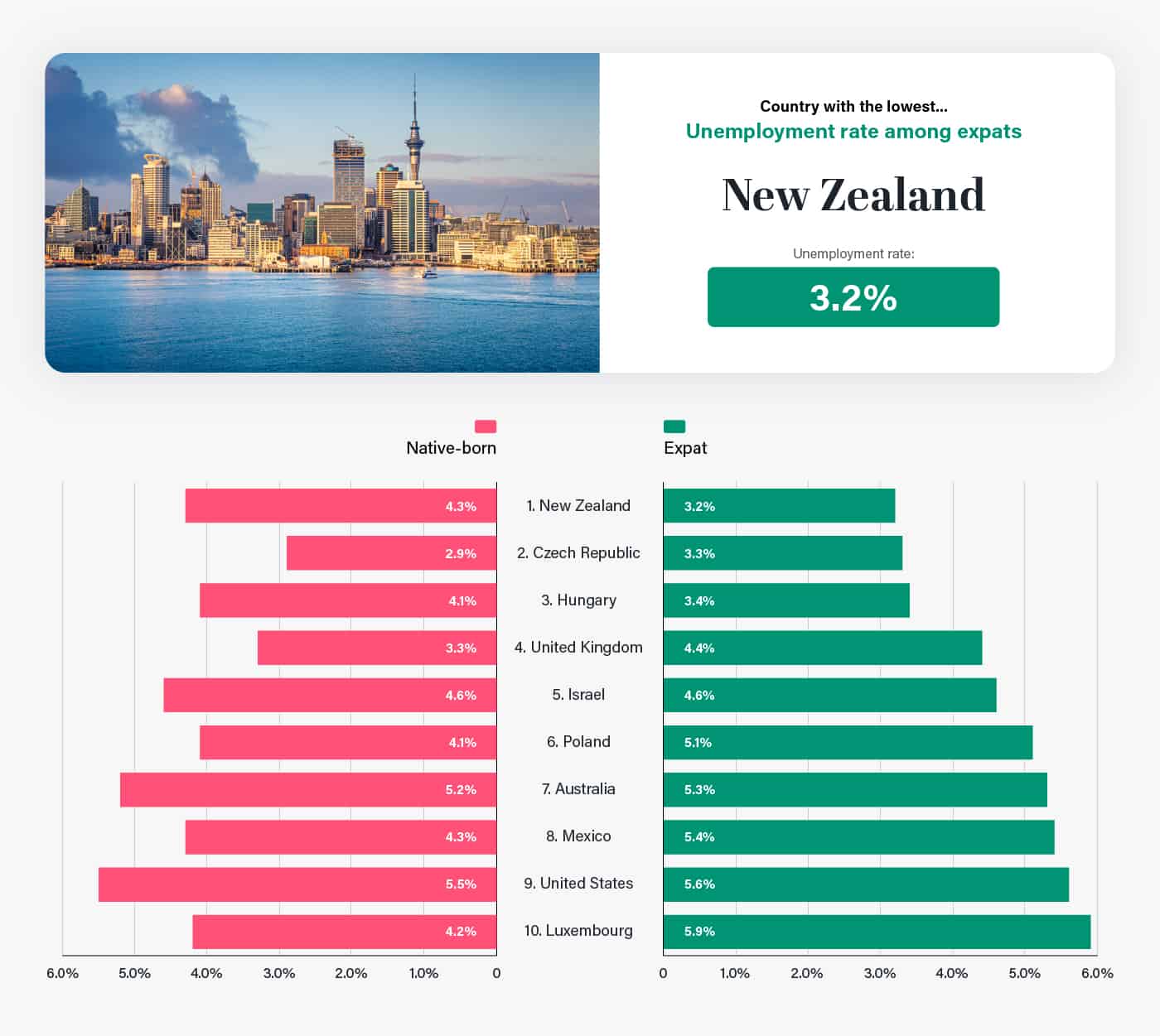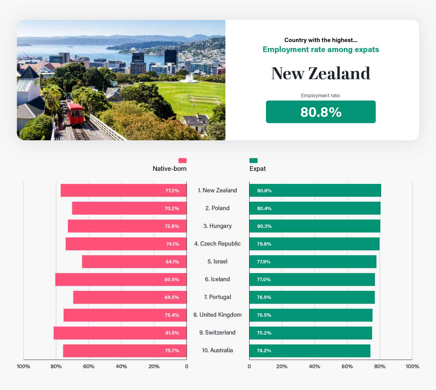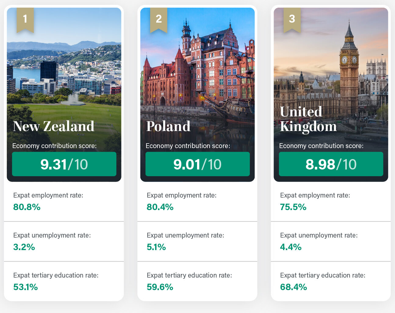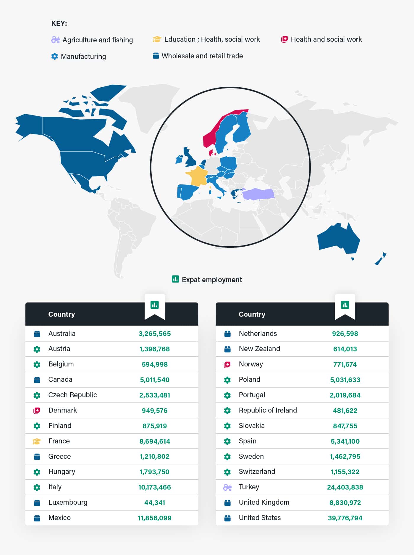 Link to Tracy Robinson user page Tracy Robinson Business Analyst Expatriates, or expats, play a significant role in the economic landscapes of the countries they reside in. Their contributions extend across various sectors, and a large expat workforce is often the sign of a dynamic and thriving economy. As well as direct contributions such as taxes, expats contribute indirectly, such as by attending tertiary (post-secondary) education and helping to grow a more highly educated workforce in the long run. But where in the world are expats fuelling the economy the most? In this article In which countries do expats contribute the most? Which country has the highest employment rate among expats? Which country has the lowest unemployment rate among expats? Which country has the highest rate of expat tertiary education? Where do expats contribute the most to the economy? Which industries employ the most expats? Expat economy index: How foreign residents shape economic growth locally Our expat economy index explores where in the world expats are fuelling the economy the most. To find out, we’ve analysed each member country of the OECD (Organisation for Economic Co-operation and Development; an intergovernmental organisation founded to stimulate economic progress and world trade). Each country was analysed on factors such as employment rates, tertiary (post-secondary) education rates and financial contributions to the economy. Want to learn more about securing your financial stability abroad? Our international life insurance is designed specifically for expats In which countries do expats contribute the most? To estimate the countries where expats are most crucial to the local economy, we analysed the following four factors: Expat employment rate Expat unemployment rate Tertiary education rate (the % of the expat population with education beyond school level) Revenue per capita ratio (the ratio of revenue contributed by expats to that of native-born individuals) 1/ New Zealand Economy Contribution Score: 9.31 out of 10 Expat Employment Rate: 80.8% Expat Unemployment Rate: 3.2% Expat Tertiary Education Rate: 53.1% New Zealand comes top, with an Economy Contribution Score of 9.31, reflecting a high economic contribution by the expat population to New Zealand’s economy. The data suggests that New Zealand’s expat population thrives economically, with high employment and low unemployment rates. The tertiary education rate indicates that over half of this demographic has pursued higher education, contributing to their economic success in the country. 2/ Poland Economy Contribution Score: 9.01 out of 100 Expat Employment Rate: 80.4% Expat Unemployment Rate: 5.1% Expat Tertiary Education Rate: 59.6% Poland is slightly behind New Zealand in second, with an overall score of 9.01 out of 10. Like New Zealand, Poland’s expat population exhibits high employment and relatively low unemployment rates. Moreover, the tertiary education rate is even higher than New Zealand’s, hinting at a well-educated expat population. 3/ United Kingdom Economy Contribution Score: 8.98 out of 10 Expat Employment Rate: 75.5% Expat Unemployment Rate: 4.4% Expat Tertiary Education Rate: 68.4% In third, with a score of 8.98 out of 10, is the United Kingdom. In the UK, the expat population also exhibits strong economic metrics with good employment and low unemployment rates. The tertiary education rate is notably high, suggesting that a significant portion of the expat population has obtained higher education. The revenue per capita ratio of 1.01 shows that those born outside the UK contribute more taxes and other contributions than those born there. Top 10 countries where expats contribute the most The working week can look very different depending on the country We look at countries with the most attractive prospects for expats Which country has the highest employment rate among expats? 1/ New Zealand Employment Rate: 80.8% New Zealand tops the list with an expat employment rate of 80.8%, even higher than native-born individuals’ employment rate (77.2%). This indicates a thriving labour market that is inclusive and welcoming to expats. New Zealand has historically had expat-friendly policies, which, along with its economic stability, contributes to the high employment rate among the expat population. The country’s demand for skilled labour in sectors like healthcare, engineering, and IT also attract expats to work there. Generally, employment rates are slightly higher for native-born individuals than for expats in most countries. However, there are exceptions, such as New Zealand, Poland and Hungary, where the employment rate for expats is higher than that of native-born individuals. Top 10 countries with the highest employment rate among expats Rank Country Native-born Expat 1 New Zealand 77.2% 80.8% 2 Poland 70.2% 80.4% 3 Hungary 72.8% 80.3% 4 Czech Republic 74.1% 79.8% 5 Israel 64.1% 77.9% 6 Iceland 80.5% 77.0% 7 Portugal 69.5% 76.9% 8 United Kingdom 75.4% 75.5% 9 Switzerland 81.5% 75.2% 10 Australia 75.7% 74.2% Safety is one of the most important factors for expats Where are the safest countries in the world? Which country has the lowest unemployment rate among expats? 1/ New Zealand Unemployment Rate: 3.2% New Zealand has the lowest unemployment rate for expats at 3.2%, even lower than the rate for native-born individuals (4.3%). The country has a reputation for its stable economy and favourable job market, which is conducive to low unemployment rates. This is further enhanced by New Zealand’s immigration policies that aim to fill gaps in the labour market by attracting skilled expats. Unemployment rates for expats are generally higher than for native-born individuals. This trend is especially pronounced in Sweden, Spain, Austria, Finland, Greece, and Belgium. Top 10 countries with the lowest unemployment rate among expats Rank Country Native-born Expat 1 New Zealand 4.3% 3.2% 2 Czech Republic 2.9% 3.3% 3 Hungary