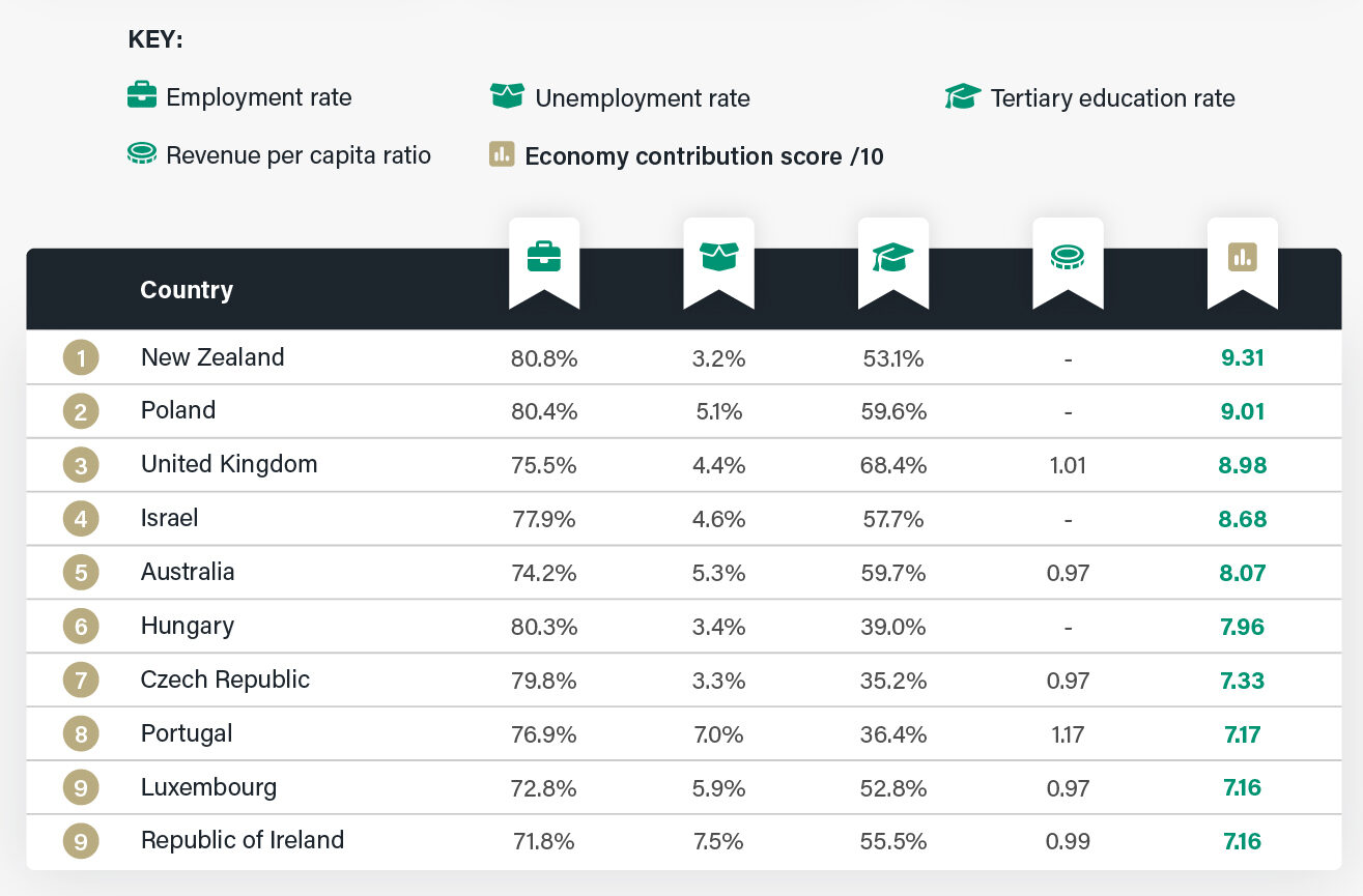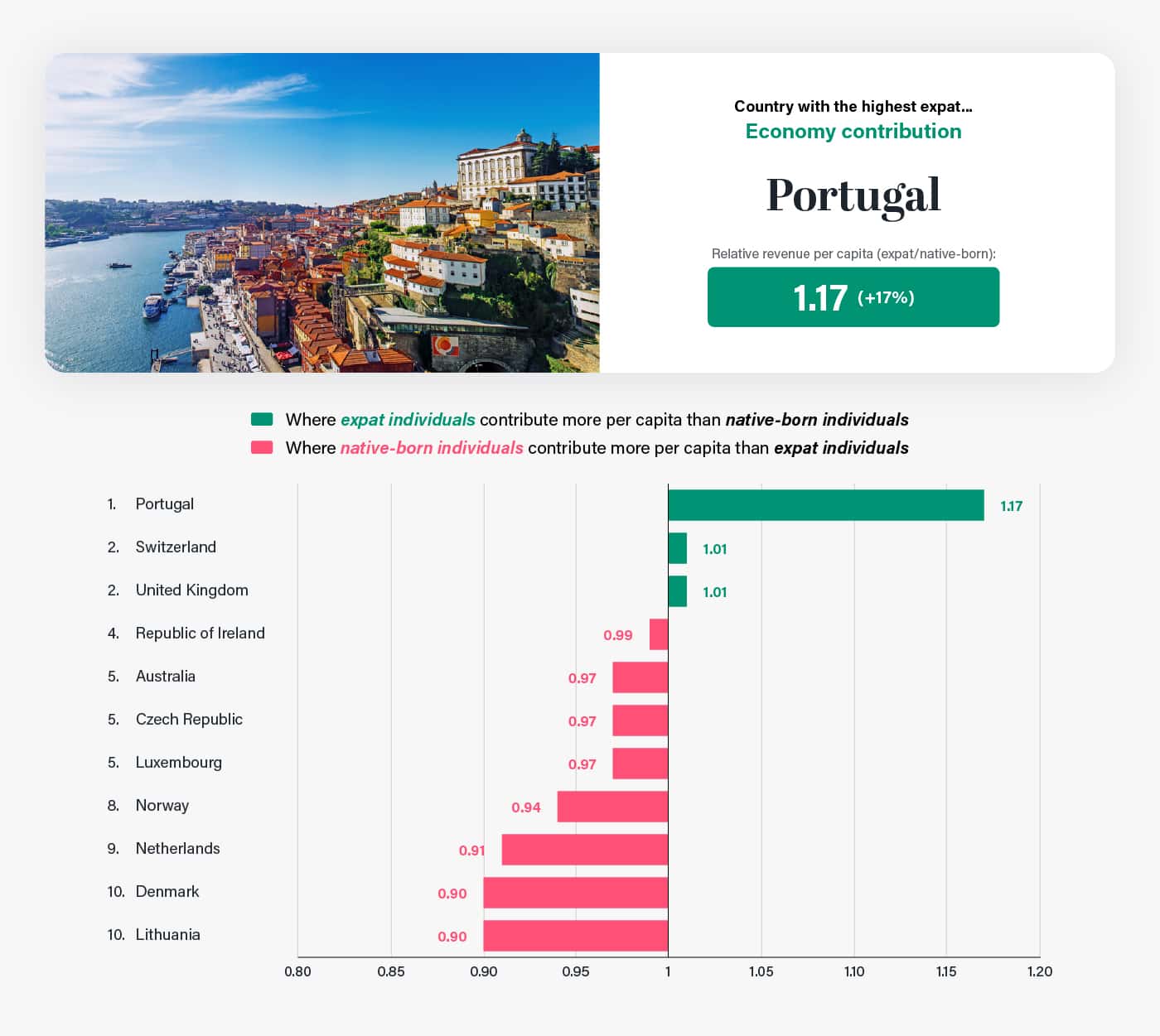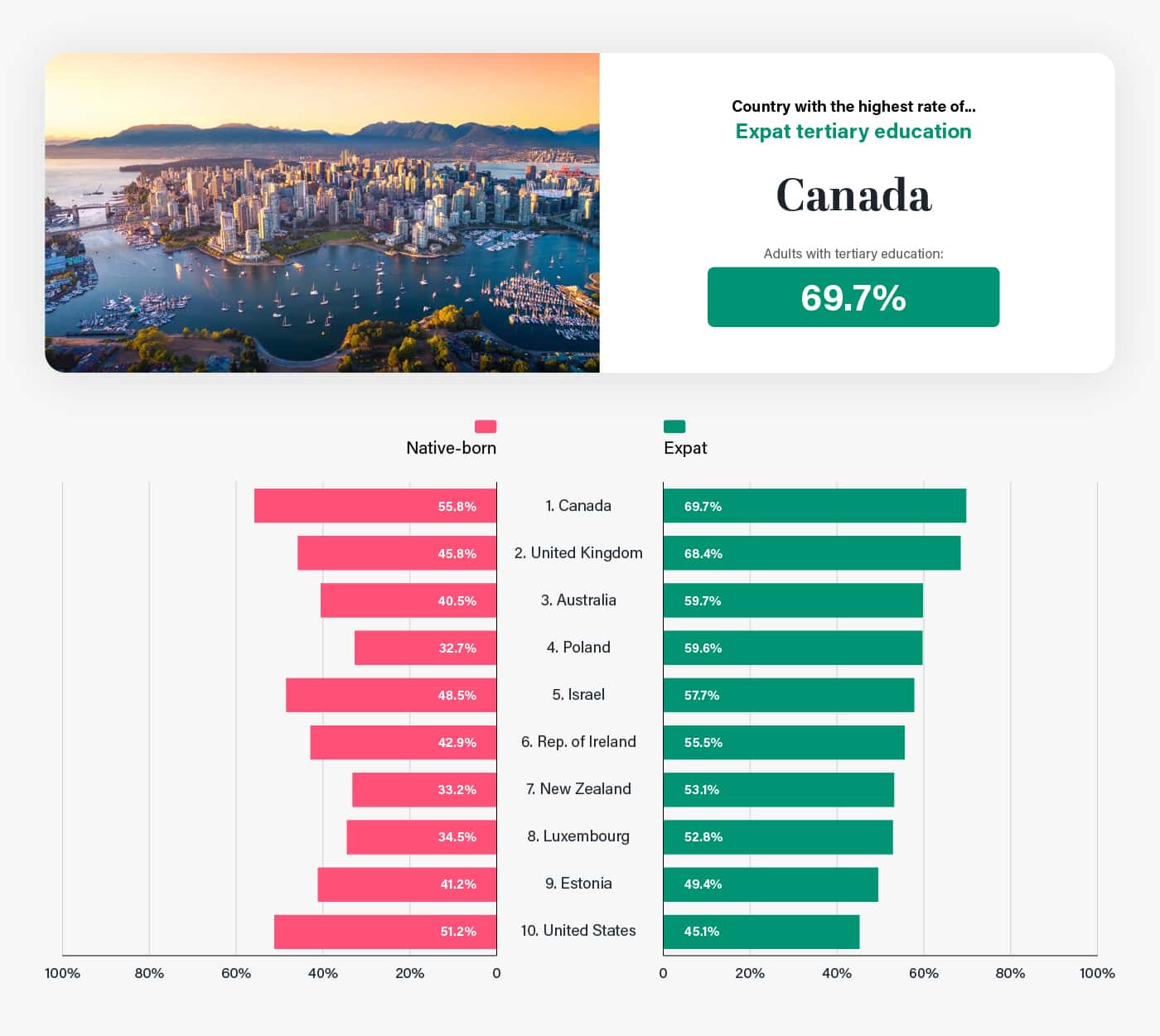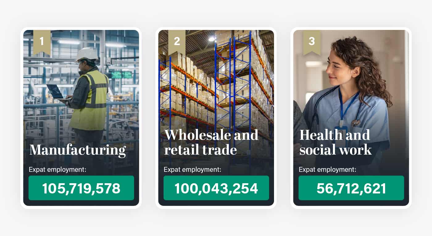 Link to Tracy Robinson user page Tracy Robinson Business Analyst Expatriates, or expats, play a significant role in the economic landscapes of the countries they reside in. Their contributions extend across various sectors, and a large expat workforce is often the sign of a dynamic and thriving economy. As well as direct contributions such as taxes, expats contribute indirectly, such as by attending tertiary (post-secondary) education and helping to grow a more highly educated workforce in the long run. But where in the world are expats fuelling the economy the most? In this article In which countries do expats contribute the most? Which country has the highest employment rate among expats? Which country has the lowest unemployment rate among expats? Which country has the highest rate of expat tertiary education? Where do expats contribute the most to the economy? Which industries employ the most expats? Expat economy index: How foreign residents shape economic growth locally Our expat economy index explores where in the world expats are fuelling the economy the most. To find out, we’ve analysed each member country of the OECD (Organisation for Economic Co-operation and Development; an intergovernmental organisation founded to stimulate economic progress and world trade). Each country was analysed on factors such as employment rates, tertiary (post-secondary) education rates and financial contributions to the economy. Want to learn more about securing your financial stability abroad? Our international life insurance is designed specifically for expats In which countries do expats contribute the most? To estimate the countries where expats are most crucial to the local economy, we analysed the following four factors: Expat employment rate Expat unemployment rate Tertiary education rate (the % of the expat population with education beyond school level) Revenue per capita ratio (the ratio of revenue contributed by expats to that of native-born individuals) 1/ New Zealand Economy Contribution Score: 9.31 out of 10 Expat Employment Rate: 80.8% Expat Unemployment Rate: 3.2% Expat Tertiary Education Rate: 53.1% New Zealand comes top, with an Economy Contribution Score of 9.31, reflecting a high economic contribution by the expat population to New Zealand’s economy. The data suggests that New Zealand’s expat population thrives economically, with high employment and low unemployment rates. The tertiary education rate indicates that over half of this demographic has pursued higher education, contributing to their economic success in the country. 2/ Poland Economy Contribution Score: 9.01 out of 100 Expat Employment Rate: 80.4% Expat Unemployment Rate: 5.1% Expat Tertiary Education Rate: 59.6% Poland is slightly behind New Zealand in second, with an overall score of 9.01 out of 10. Like New Zealand, Poland’s expat population exhibits high employment and relatively low unemployment rates. Moreover, the tertiary education rate is even higher than New Zealand’s, hinting at a well-educated expat population. 3/ United Kingdom Economy Contribution Score: 8.98 out of 10 Expat Employment Rate: 75.5% Expat Unemployment Rate: 4.4% Expat Tertiary Education Rate: 68.4% In third, with a score of 8.98 out of 10, is the United Kingdom. In the UK, the expat population also exhibits strong economic metrics with good employment and low unemployment rates. The tertiary education rate is notably high, suggesting that a significant portion of the expat population has obtained higher education. The revenue per capita ratio of 1.01 shows that those born outside the UK contribute more taxes and other contributions than those born there. Top 10 countries where expats contribute the most The working week can look very different depending on the country We look at countries with the most attractive prospects for expats Which country has the highest employment rate among expats? 1/ New Zealand Employment Rate: 80.8% New Zealand tops the list with an expat employment rate of 80.8%, even higher than native-born individuals’ employment rate (77.2%). This indicates a thriving labour market that is inclusive and welcoming to expats. New Zealand has historically had expat-friendly policies, which, along with its economic stability, contributes to the high employment rate among the expat population. The country’s demand for skilled labour in sectors like healthcare, engineering, and IT also attract expats to work there. Generally, employment rates are slightly higher for native-born individuals than for expats in most countries. However, there are exceptions, such as New Zealand, Poland and Hungary, where the employment rate for expats is higher than that of native-born individuals. Top 10 countries with the highest employment rate among expats Rank Country Native-born Expat 1 New Zealand 77.2% 80.8% 2 Poland 70.2% 80.4% 3 Hungary 72.8% 80.3% 4 Czech Republic 74.1% 79.8% 5 Israel 64.1% 77.9% 6 Iceland 80.5% 77.0% 7 Portugal 69.5% 76.9% 8 United Kingdom 75.4% 75.5% 9 Switzerland 81.5% 75.2% 10 Australia 75.7% 74.2% Safety is one of the most important factors for expats Where are the safest countries in the world? Which country has the lowest unemployment rate among expats? 1/ New Zealand Unemployment Rate: 3.2% New Zealand has the lowest unemployment rate for expats at 3.2%, even lower than the rate for native-born individuals (4.3%). The country has a reputation for its stable economy and favourable job market, which is conducive to low unemployment rates. This is further enhanced by New Zealand’s immigration policies that aim to fill gaps in the labour market by attracting skilled expats. Unemployment rates for expats are generally higher than for native-born individuals. This trend is especially pronounced in Sweden, Spain, Austria, Finland, Greece, and Belgium. Top 10 countries with the lowest unemployment rate among expats Rank Country Native-born Expat 1 New Zealand 4.3% 3.2% 2 Czech Republic 2.9% 3.3% 3 Hungary