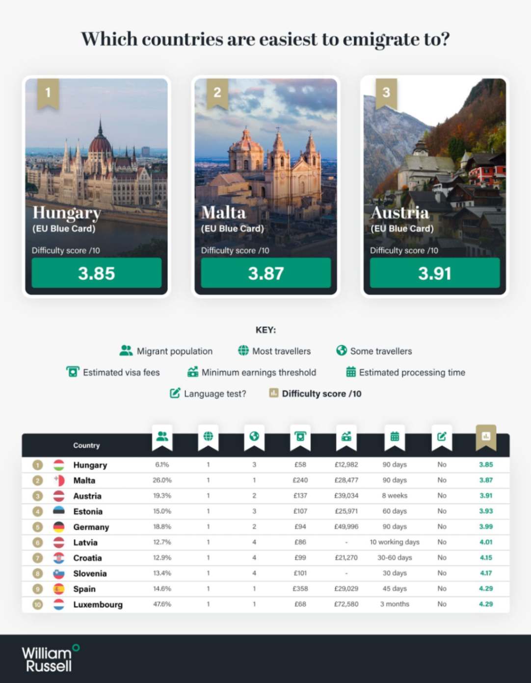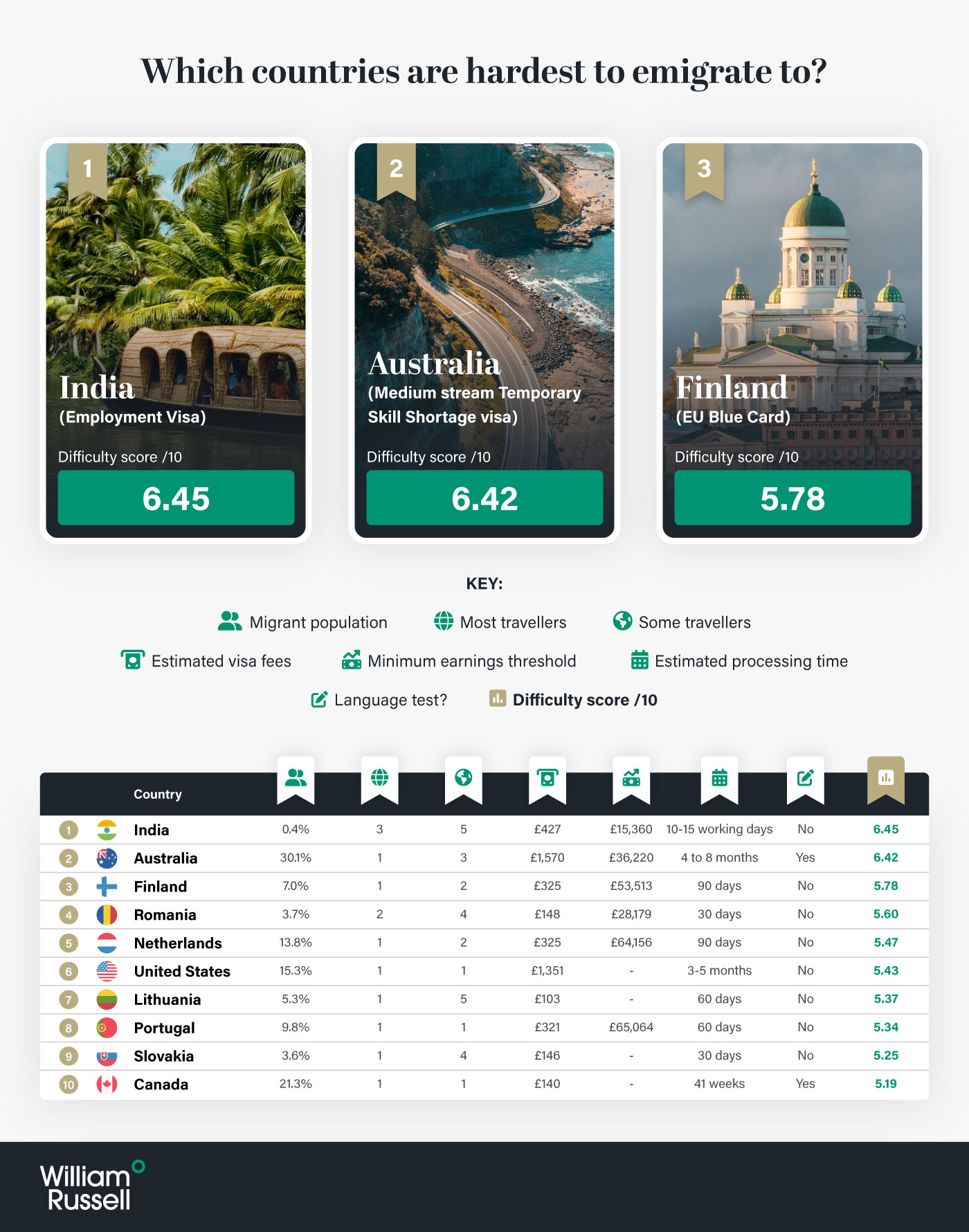 Link to Kim McClatchie user page Kim McClatchie Head of HR Relocating to a new country as an expat can be an exciting but challenging experience. Some countries have strict immigration laws, and there may be other barriers, such as vaccine or language requirements and hefty fees to be paid. But which are the trickiest for those looking to emigrate? We’ve compared some common expat destinations to find out. In this article Which countries are hardest to emigrate to? Which country requires the most vaccinations? Which country has the highest visa-related fees? Which countries are easiest to emigrate to? Which are the trickiest countries to emigrate to? Not all countries make immigration easier for foreigners. There are a number of factors that can make it tricky to move abroad, including: Expat population Recommended vaccines Work visa fees Work visa minimum earnings threshold Estimated work visa processing time Language proficiency tests Of course, requirements vary depending on the specific visa you’re applying for, so to keep things consistent, we’ve looked at the closest equivalent to a skilled worker visa for each country. You should always be prepared before you plan on moving and be aware of which countries are most likely to reject your visa or residence application. If you want to relocate, don’t forget about international health insurance. A detail that is often overlooked yet plays a crucial role in ensuring the wellbeing of expats and their families. What are the cheapest and most expensive countries to move to? Our relocation calculator highlights the average costs of moving abroad Which countries are hardest to emigrate to? 1/ India Employment Visa / 6.45 India tops the list with its Employment Visa, having a difficulty score of 6.45. India has a low expat population percentage (0.4%), the visa demands significant fees of 16.25 lakh (roughly £427), and you’ll require at least three vaccinations (with a further five depending on circumstances). 2/ Australia Medium Stream Temporary Skill Shortage Visa / 6.42 Australia follows closely with its Temporary Skill Shortage visa (medium stream). This visa has a high difficulty score of 6.42, reflecting Australia’s higher fees (AU$3,035/£1,570), long processing times (4 to 8 months) and the fact that you must pass an English-language proficiency test. 3/ Finland EU Blue Card / 5.78 Finland, offering the EU Blue Card, has a difficulty score of 5.78. Finland has a high earnings threshold for applicants for a Blue Card, at €62,508 (£53,513), as well as application costs of €380 (£325). Living abroad is a fantastic experience, but it’s not without its risks Find out how to protect your life and well-being as an expat Which country has the fewest expats? India has the fewest expats / 0.4% Looking at the number of expats currently residing in a country gives us a general idea of how easy it is for people to move there and how appealing it is to expats. It also provides an idea of how easy it will be to adapt to a new country, which is always easier if there’s already a significant expat community. Remarkably, just 0.4% of India’s population were born outside the country. Which country requires the most vaccinations? India requires the most vaccinations / 3-5 vaccinations Another consideration when moving countries is whether or not you’ll need to book any vaccinations. On top of routine vaccinations such as measles-mumps-rubella (MMR), most travellers to India require vaccinations for hepatitis A, tetanus and typhoid. On top of these, some travellers may also need to be vaccinated against cholera, hepatitis B, Japanese encephalitis, rabies and tuberculosis. Tempted to take your work with you abroad? We look at all the countries offering digital nomad visas Which country has the highest visa-related fees? Australia has the highest visa-related fees / £1,570 For the medium-term stream of Australia’s Temporary Skill Shortage visa (subclass 482), the costs start at (AU$3,035/£1,570). There may also be other costs, such as your English language tests, health checks and police certificates. Which country has the highest salary threshold? Luxembourg has the highest salary threshold / £72,580 Many countries require applicants to earn over a certain amount to qualify for a worker’s visa. This includes the EU Blue Card, with each government setting its own threshold. Luxembourg has the highest, at €84,780 (£72,580). It’s important to note that these figures can vary year by year, and for certain professions that are in high demand or require specific skills, the threshold may be lower. Relocating without health insurance could end up costly How much does medical treatment cost abroad? Which country takes the longest to process applications? Canada takes the longest to process applications / 41 weeks One of the most painful parts of the process can be waiting for your application to go through. According to the Government of Canada’s processing time tool, wait times for a temporary residence work permit for someone from the UK currently stand at around 41 weeks, but these are subject to change. Which countries require a language proficiency test? Australia, Canada and the United Kingdom all require a language proficiency test Some countries require language proficiency tests for their work visa application process. Three countries on our list make these tests a requirement, with all three being English-speaking countries. However, while other countries might not require you to pass a test, the application process and documentation will likely be in the local language. If your job requires you to communicate in that language, then not speaking it is likely to count against you. It’s also important to note that other types of visas may require a language test. Looking to protect your income in event of an injury or illness? Find out about international income protection insurance Which countries are easiest to 